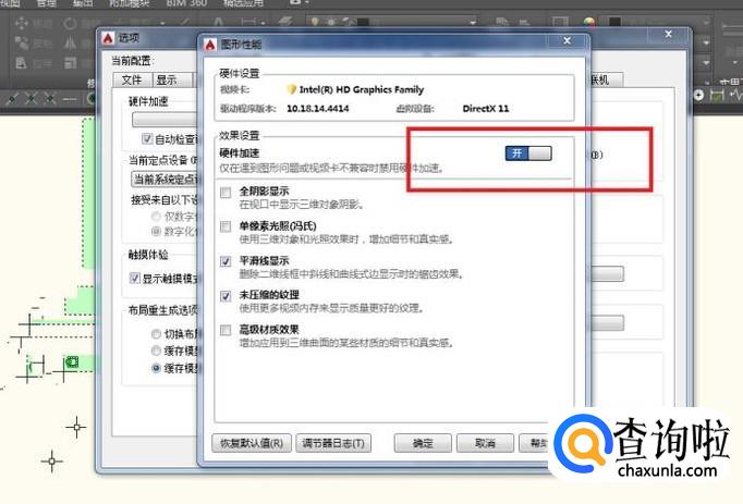 点击进入图形性能的命令对话框后,找到硬件加速此时的状态为“开”,把“开”切换成“关”,并点击确定;