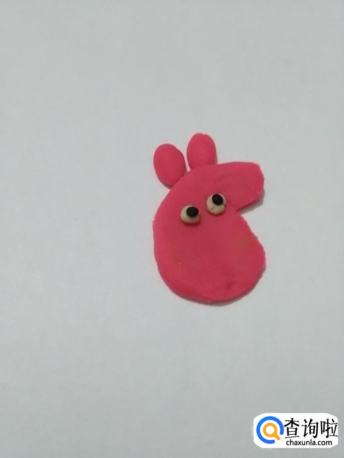用粉色团两个椭圆形,粘在头上,当作两只耳朵。