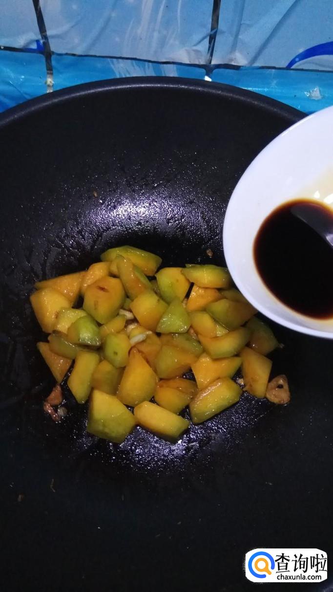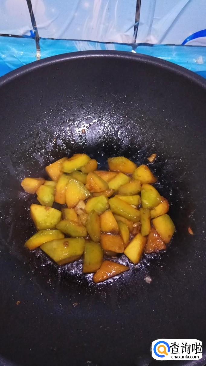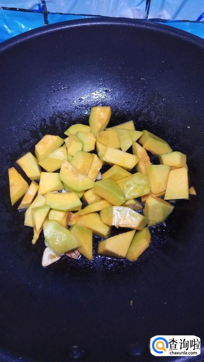 炒至南瓜开始变色,将浇汁儿倒进去,快速翻拌,将浇汁儿收干,在糖色的影响下,南瓜开始变得更加好看。