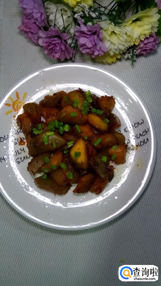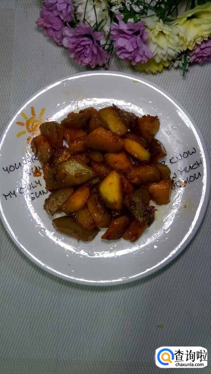 汤汁收干后,将南瓜盛出放入盘中。
