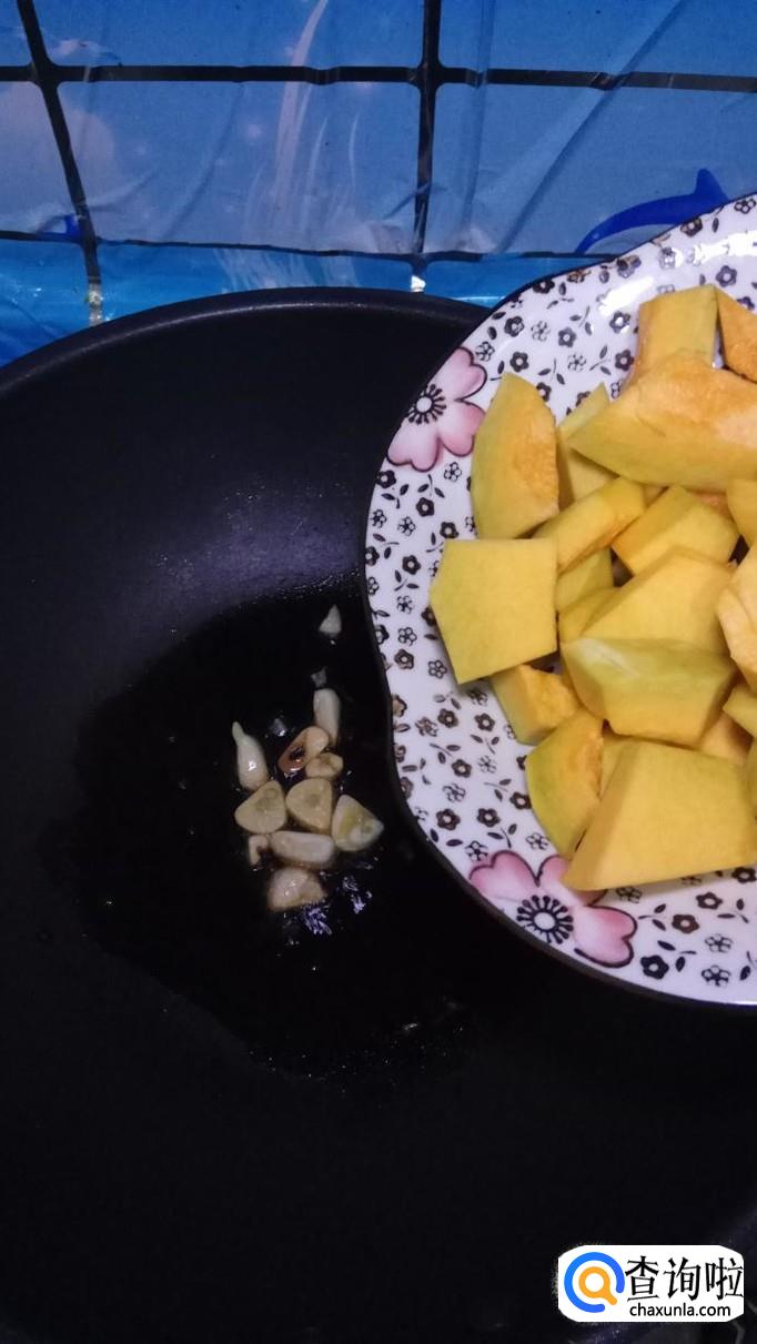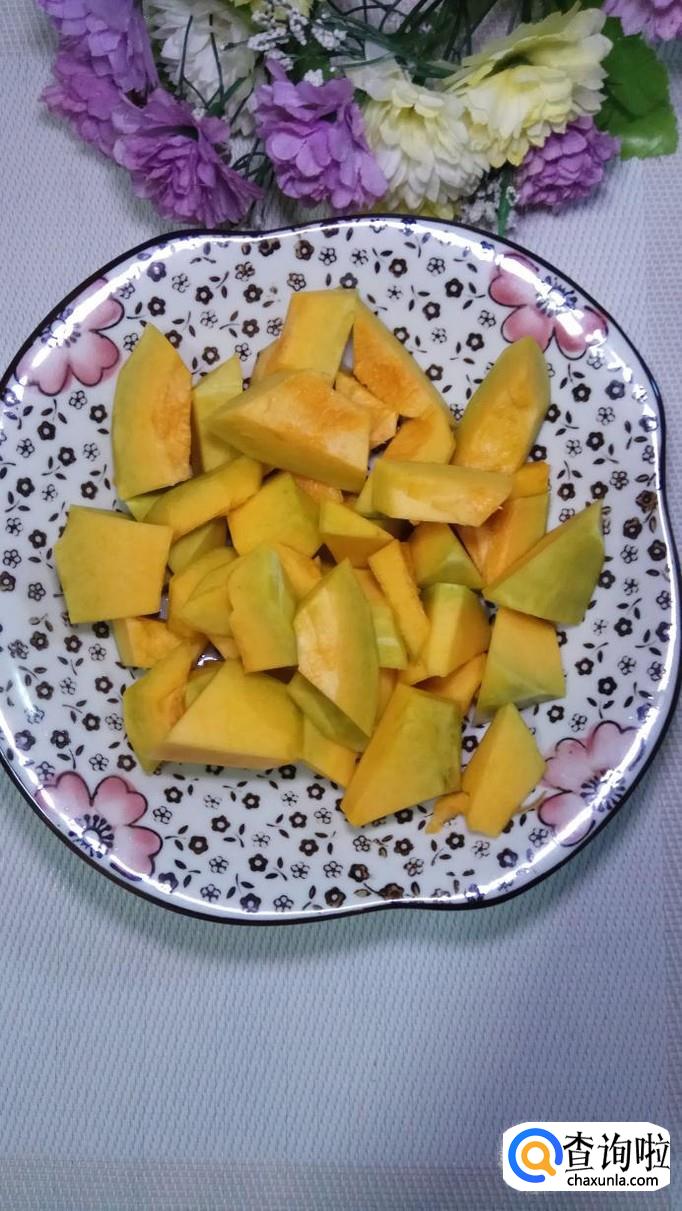 准备一个小南瓜,洗净去皮,切成块,放入盘中备用,如图所示,注意,南瓜块不能切得太小,否则容易散,也不能太大,否则太难熟。