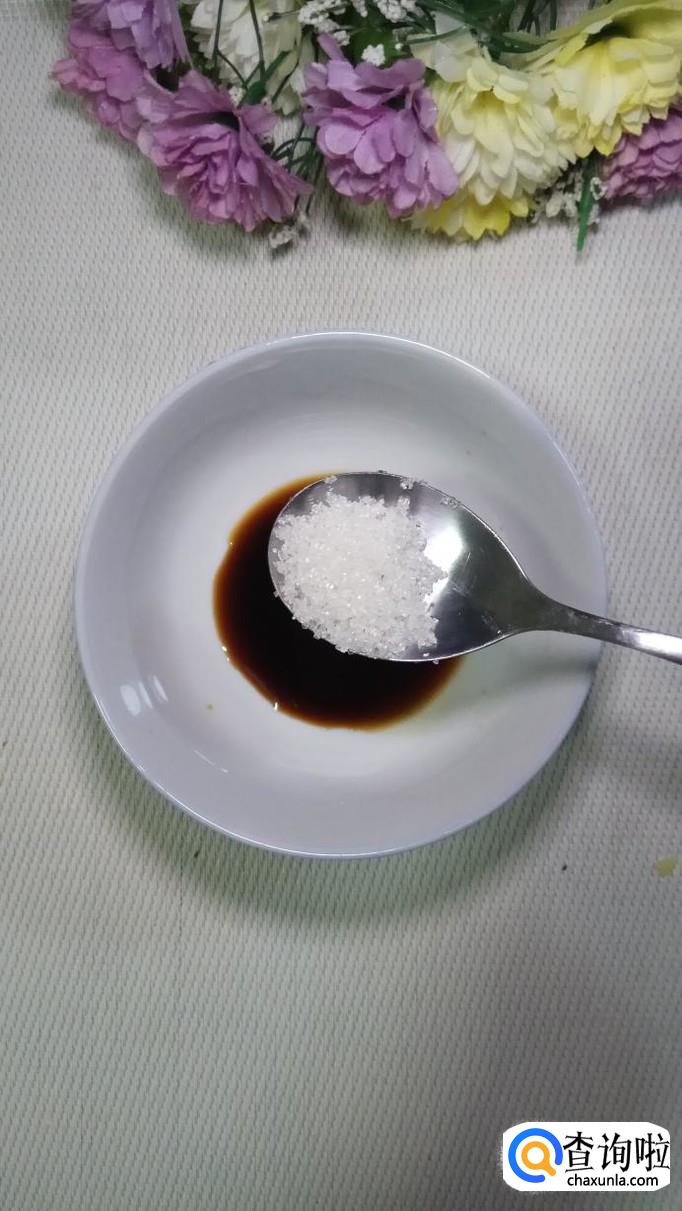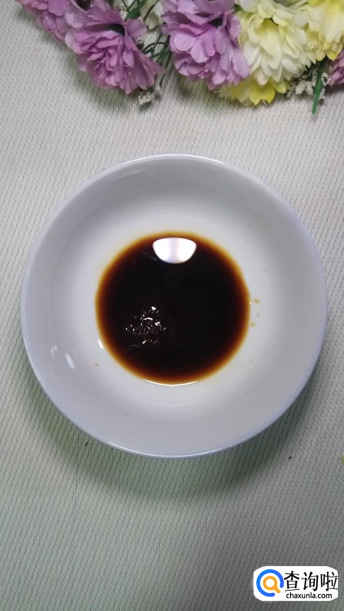 准备浇汁,碗中放入适量生抽,少量陈醋。生抽本身带咸味儿,放了生抽就不用加食盐了,陈醋的量也不能太多,太多的话容易发酸。也不能不放,少放一些可以提鲜。
