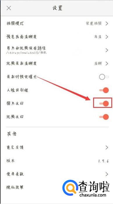 在设置页面可以看到“照片水印”的开关,点击即可将其关闭,如图所示。