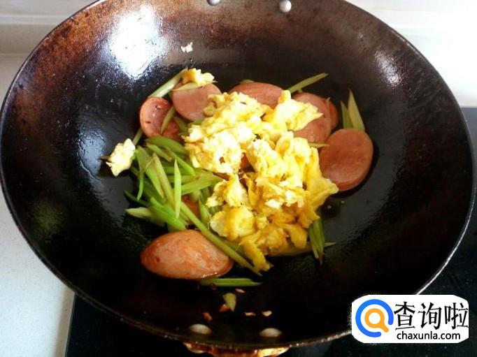 香肠略翻炒一下即可,随即放入芹菜大火爆炒,放入盐(慎重放盐,香肠含有盐)。