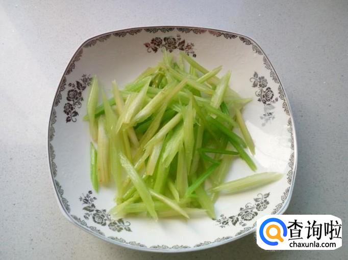 芹菜用开水汆一下,入锅几秒钟即捞出,迅速用冷水过凉,沥干水分,备用。