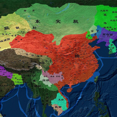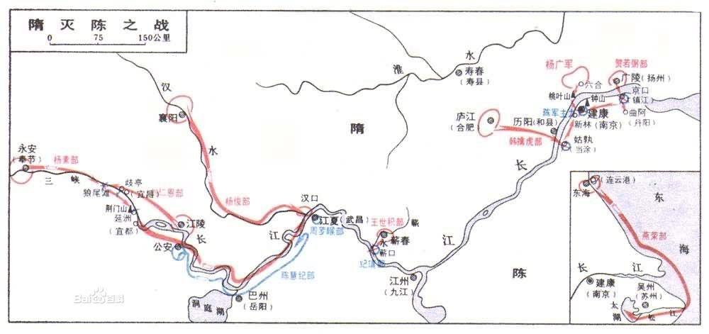 南下灭陈 隋灭陈之战形势图隋文帝意图南灭南朝陈,采纳高颎的策略,干扰陈的农业生产,破坏陈的军事储积,使陈损失惨重。隋文帝于隋与突厥之战胜利后,开皇七年(587年)十月废除西梁。次年发动灭陈战争,隋文帝命晋王杨广为行军元帅、秦王杨俊、河清公杨素为副帅、高颎为参谋、王韶为司马,兵分八路攻南朝陈。 杨素率水军从巴东顺长江东下,与荆州刘仁恩军联合占领延州(今长江西陵峡口、湖北枝江附近)等上游陈军防御。由公安东援建康之中游陈军也被杨俊军阻于汉口一带,为下游隋军创造有利条件。下游隋军主力乘陈朝欢度元会(即春节)之机分路渡江。行军总管韩擒虎、贺若弼两军钳击建康,与宇文述军包围建康。 开皇九年(589年)二月,隋军攻入建康,俘陈后主,陈亡。开皇十年(590年)九月,隋派使臣韦洸等人安抚岭南,冼夫人率众迎接隋使,岭南诸州悉为隋地,隋朝完成了全国统一。 开皇之治 隋文帝杨坚隋文帝倡导节俭,节省了一定政府开支、废除了一些不必要的苛捐杂税并设置谷仓储存食粮。杨坚成功地统一了历经数百年分裂的中国,从此在大多数的世纪里都保持着隋朝建立的统一。