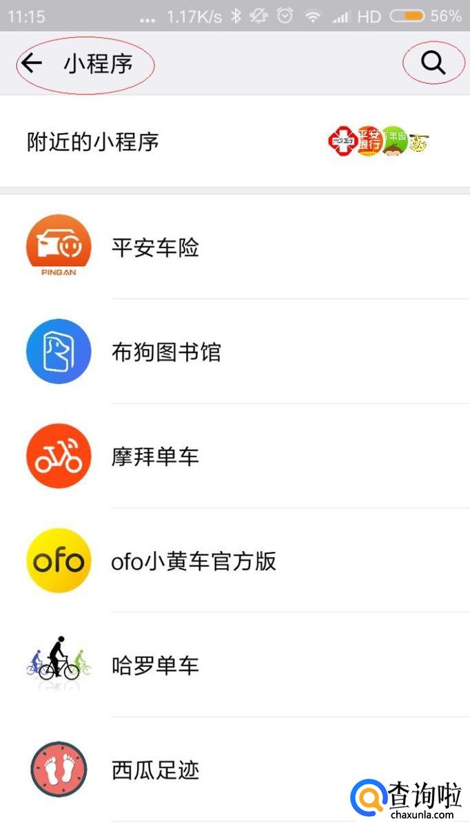 唤出"小程序"选项,如图所示。点击右上侧"搜索"图标,搜索文本框输入"Exif"字符。