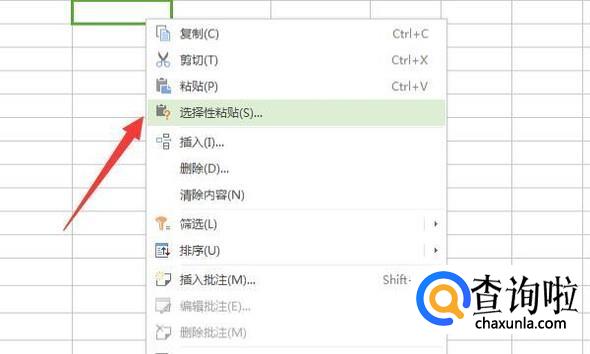 在要粘贴的区域,右击鼠标,并点击“选择性粘贴”。