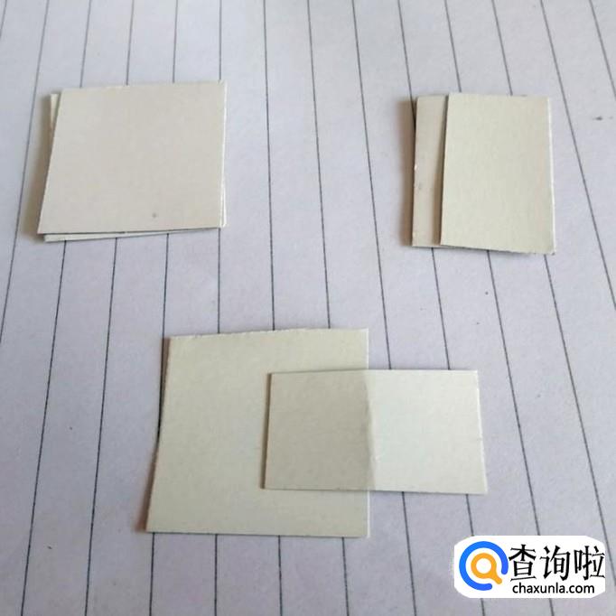 今天咱们只用到纸和双面胶来做手工房子。先把白色硬卡纸剪成六个正方体,四个长方体,如图所示。