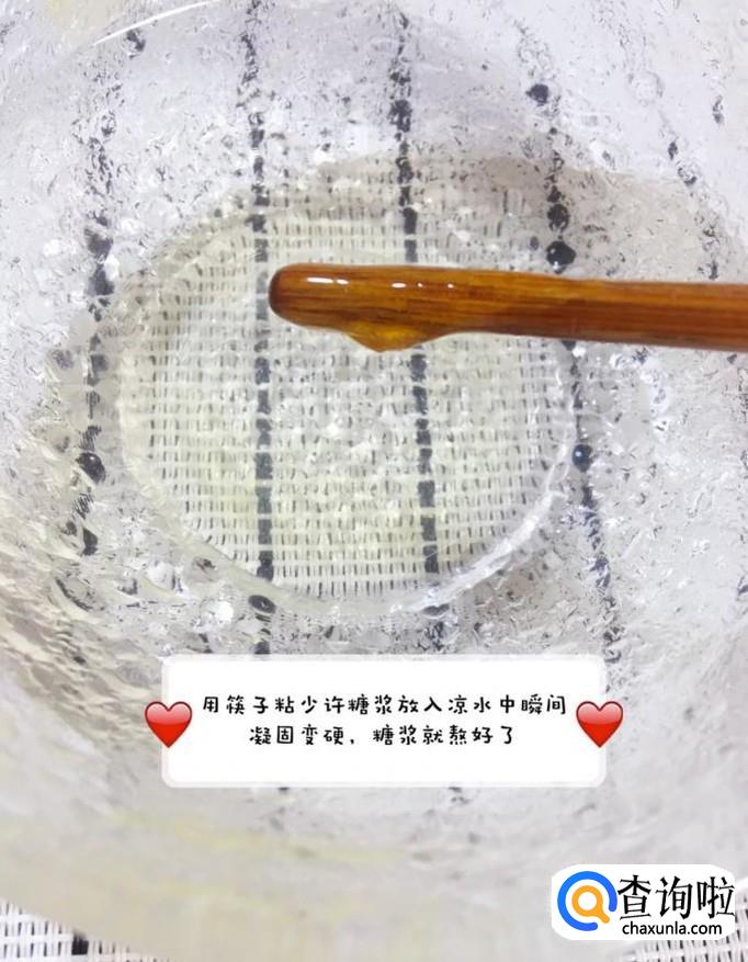 然后拿出一支筷子沾上一些糖浆滴入冷水中,如果会马上凝固成糖块,那么说明我们的糖浆熬好了。