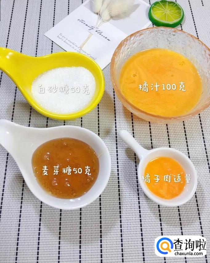 首先准备好我们要用到的所有食材,如下图所示。小贴士:白砂糖50克,麦芽糖50克,橘子100克。橘子肉适量。