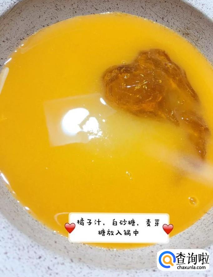 接着将橘子汁、白砂糖和麦芽糖一起倒入锅中,如下图所示。