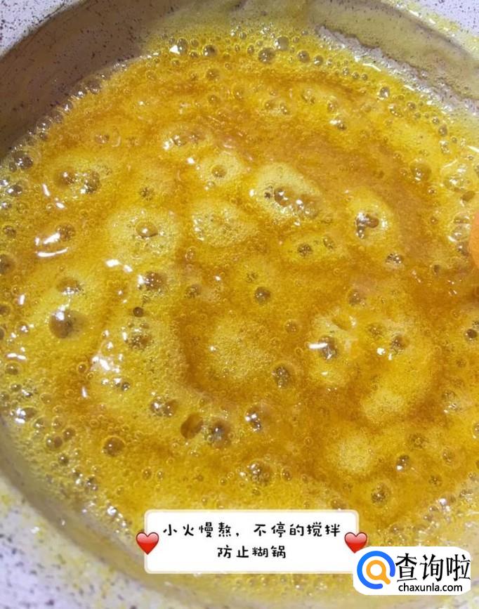 接着开小火慢慢搅拌,如下图所示。这样做能够有效的防止糖粘锅。