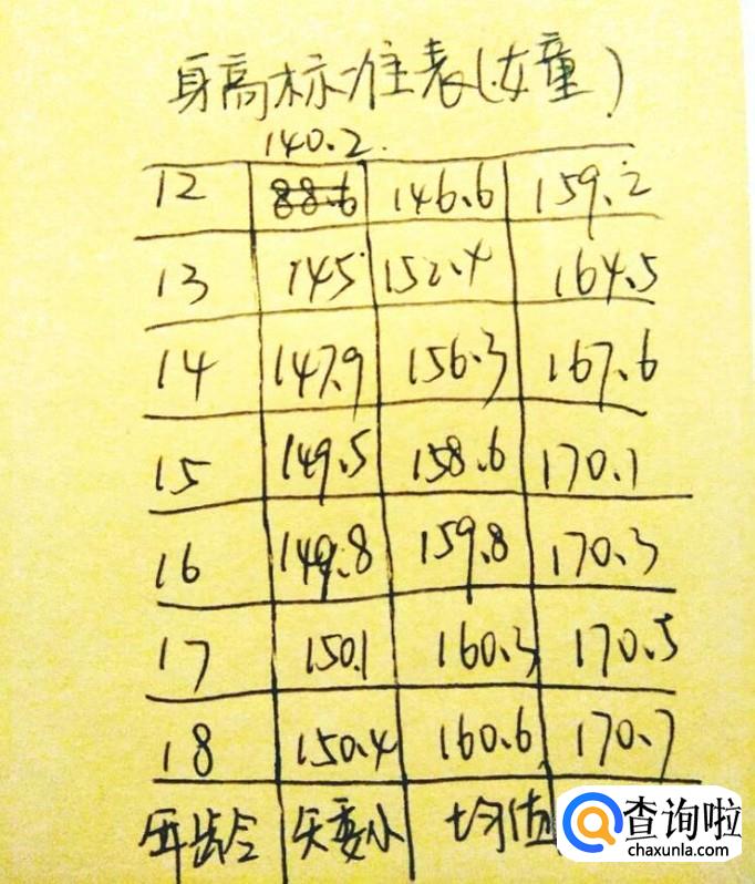 然后就是女性的身高标准表,女性的普遍身高会比男性稍微矮一些,平均身高在一米五五左右。