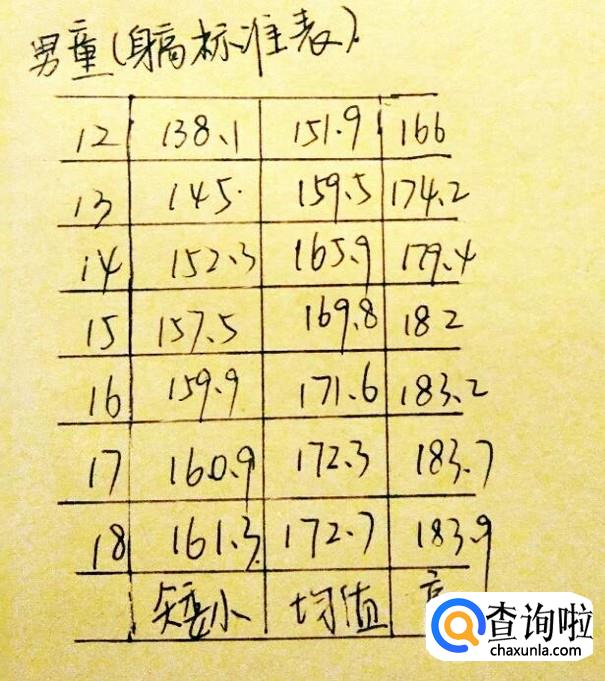 如下图所示,这是男性儿童12岁到18岁的身高标准表,有身高标准表可以看出男性儿童在12至18岁普遍身高在一米六五,大家可以对照这份标准表来判断自己的孩子身高是否标准。