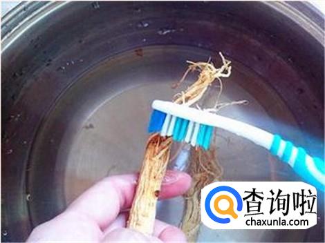 找个硬毛刷子,将人参上上下下全部刷洗一遍,包括人参的芦头以及根须。