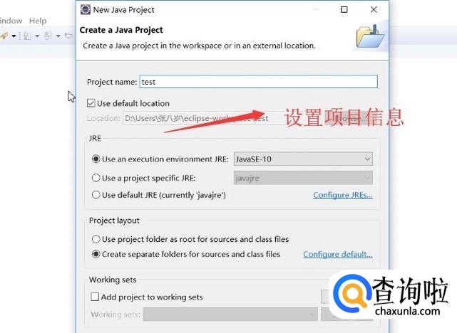 在弹出的新建Java Project界面中我们给项目起一个名字,然后选择合适的JRE版本,如下图所示