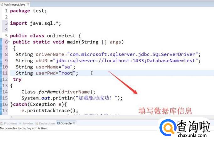 然后我们在java文件的main函数中填写数据库驱动名称以及刚才建的Sql Server数据库名称,如下图所示