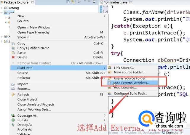 接下来右键项目名称,选择Build Path下面的Add External Archives选项,如下图所示