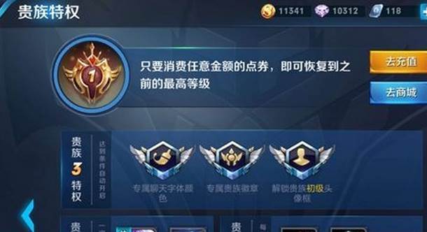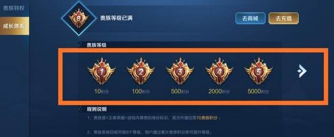 在王者荣耀手游中,玩家每消耗1元购买10点券,消费后可获得10积分。而贵族等级7级需要20000积分,也就需要消耗20000点券相当于2000人民币。除此之外,贵族等级8需要50000积分(5000人民币)才能获得。