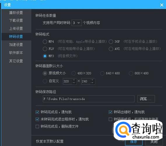 在“转码格式”里选定“MP3”,在点击下面的“保存”,就可以下载了,下载完后这个视频就被转换成MP3格式了。