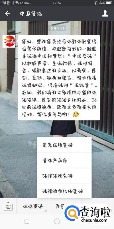 用微信查询,先打开你的微信并且登录,在公众号里输入“中国普法”,搜索出后点击关注。