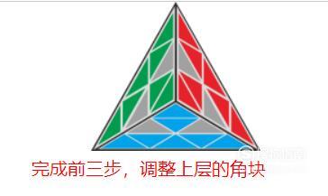 如左图示:是一个蓝、红、绿的角块朝上,金字塔魔方共有四个颜色(蓝、红、绿、黄),根据金字塔魔方的结构原理,金字塔魔方的角块之间是不能更换位置,所以一个角块没有的颜色,该颜色在这个角块所在的三个面上最终还原的时候是不会出现的。