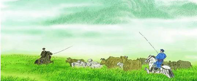 “敕勒川,阴山下”,诗歌一开头就以高亢的音调,吟咏出北方的自然特点,无遮无拦,高远辽阔。这简洁的六个字,格调雄阔宏放,透显出敕勒民族雄强有力的性格。