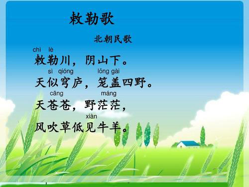 这首民歌,勾勒出了北国草原壮丽富饶的风光,抒写敕勒人热爱家乡热爱生活的豪情,境界开阔,音调雄壮,语言明白如话,艺术概括力极强。