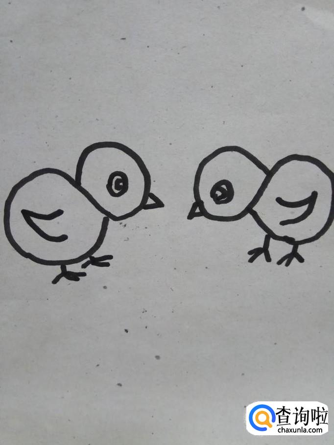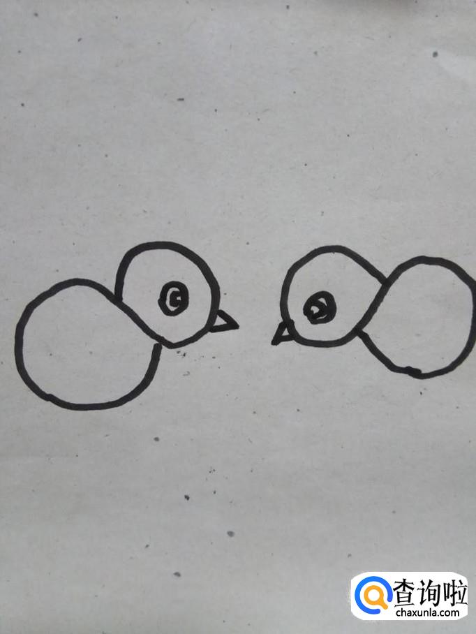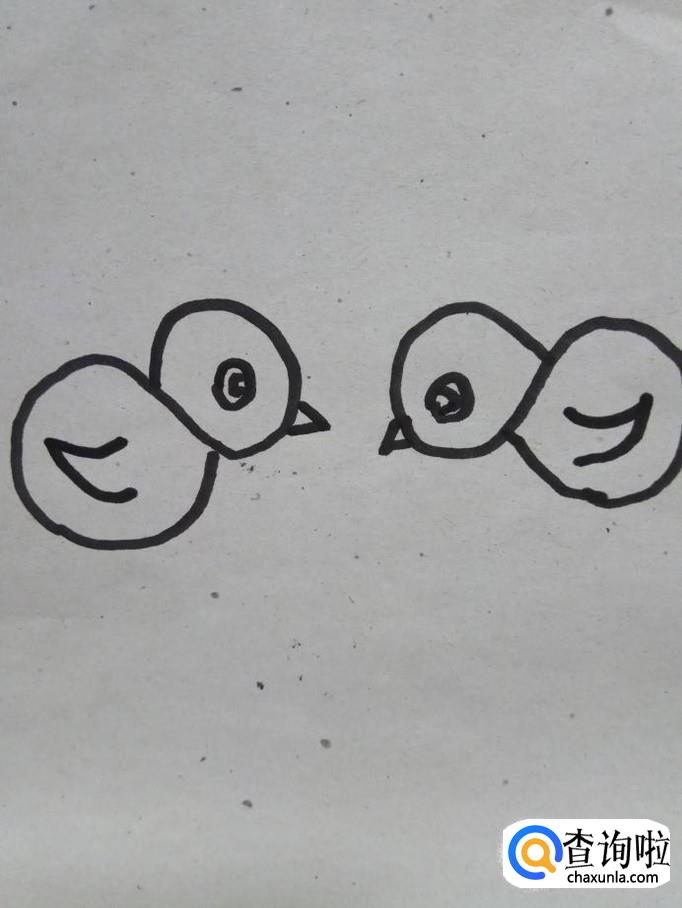 画两个小弧线,弧线的尾部相连,画出小鸡的翅膀,另外一只小鸡也是这样画,这是两只小鸡的翅膀。