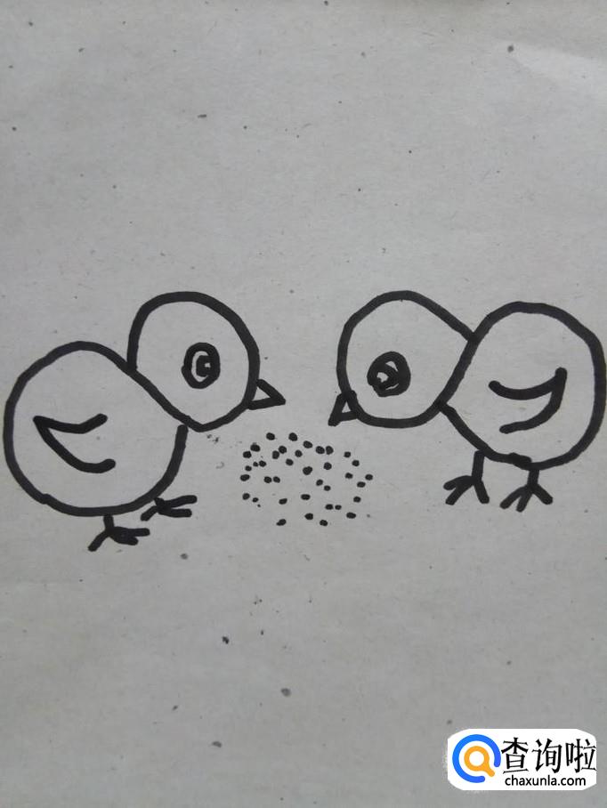 在两只小鸡的嘴巴下边画一些小点儿。这是小鸡在吃小米呢。