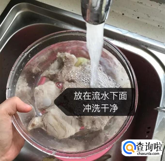 接着将煮好的排骨用流水清洗干净,如下图所示。小贴士:大家在做这一步的时候,一定要把粘在上面的血水冲洗干净。