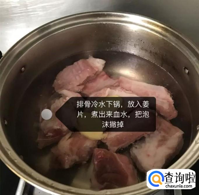 然后将排骨冷水下锅,放入姜片,煮出血水,把血沫撇去,如下图所示。小贴士:如果你的排骨汤是做给大人喝的,可以加入适量的料酒,这样去除腥味的效果会更加明显。