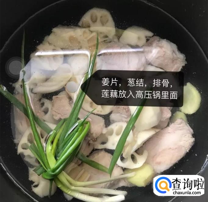 然后把冲洗好的排骨倒入高压锅,加入姜片,葱结和莲藕,如下图所示。