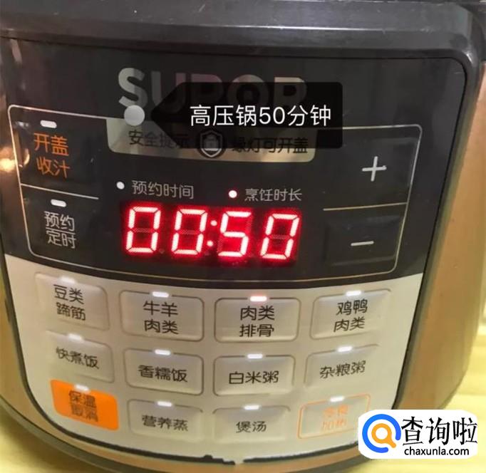 接着选择相应的功能煮50分钟,如下图所示。小贴士:如果大家选择用的是普通高压锅,压15分钟就差不多了。