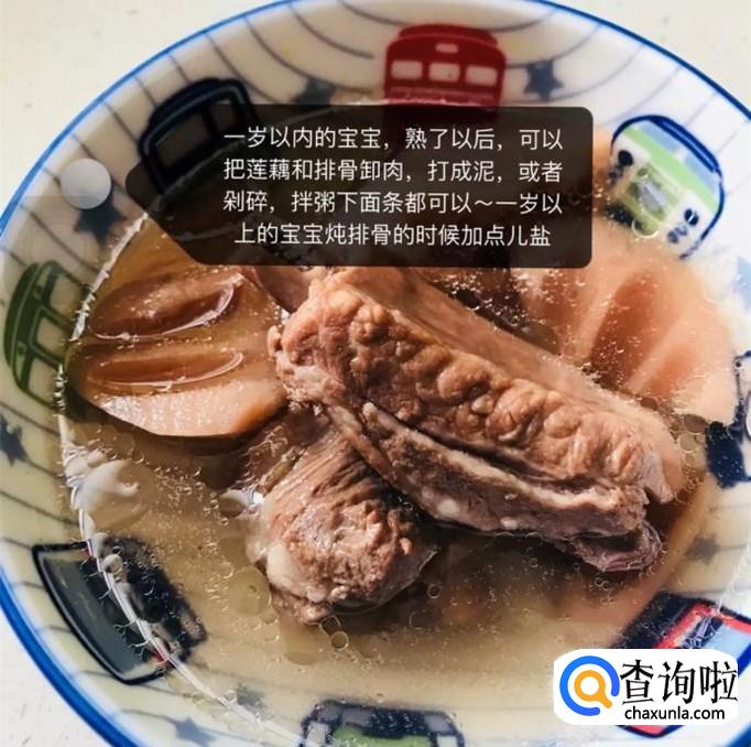 等到排骨和莲藕啊煮熟以后,可以把莲藕和排骨精的肉打成泥,这样能够方便宝宝食用。