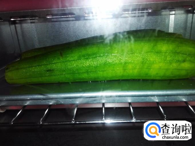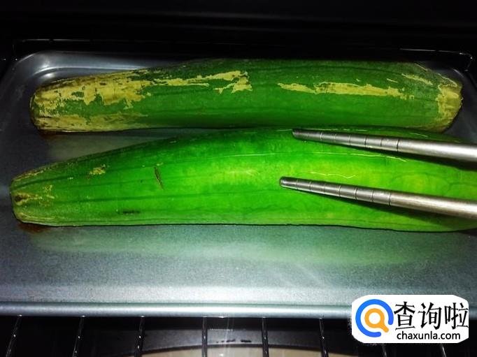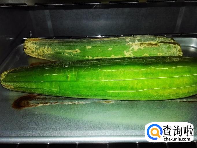 烤得10分钟左右,打开烤箱把丝瓜翻转一下,再继续烤。