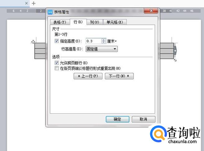 进入“表格属性”后,进入行选项卡,设置行高为固定值0.3厘米后确定。
