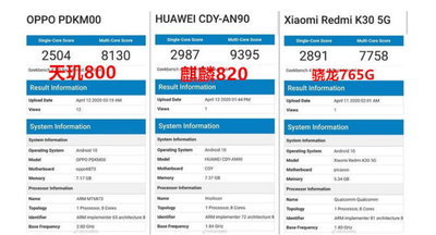 天玑800相当于骁龙765G搭载天玑800的OPPO A92s的安兔兔V8跑分:总分295798分稍微低于骁龙765G的32万分左右。跟麒麟820的38万分差距比较大。Geekbanch5的分数 :单核弱于骁龙765G、多核强于骁龙765G。但是输给麒麟820。