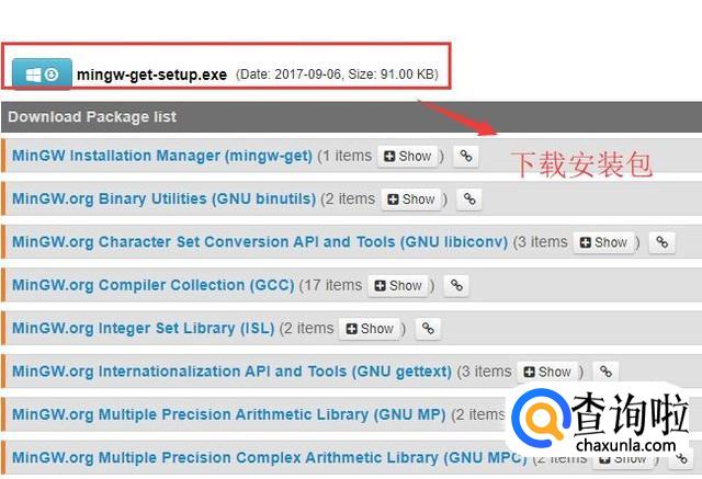 首先我们需要登MinGW的官方平台,进入下载列表,找到Windows下的MinGW安装包进行下载,如下图所示