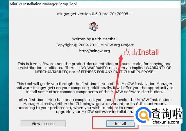 接下来点击下载好的MinGW安装包进入安装向导,点击底部的Install按钮,如下图所示