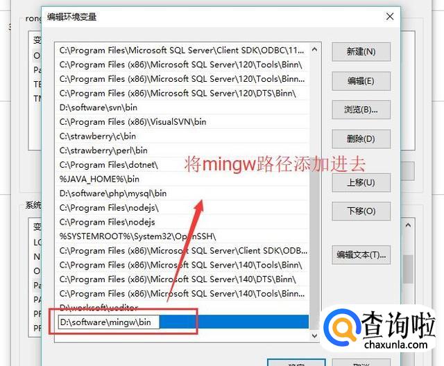 然后我们在Path环境变量中将刚才安装的MinGW路径添加进去,如下图所示