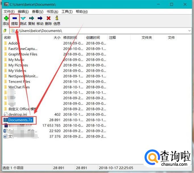 打开7-zip,选中要解压的文件,,然后点击菜单栏的“提取”。
