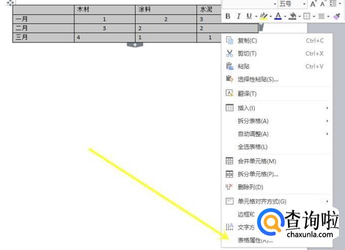 首先新建word表格,输入文字,然后选中全部表格,点击鼠标右键,选择表格属性