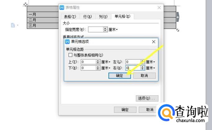 将表格的上下左右距离全部调整为 0 ,点击确定