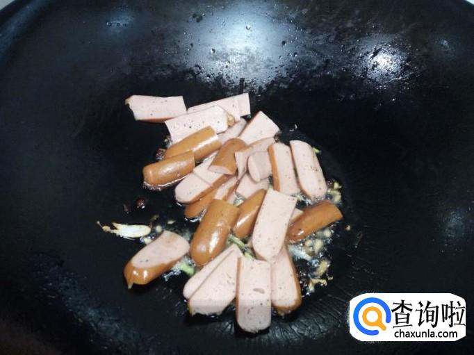 锅里放入油加热,油热后放入花椒,葱,姜,爆锅。放入脆皮肠小火翻炒,放入料酒。