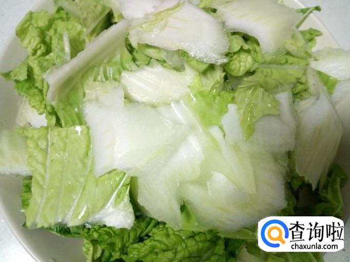 把白菜片用水焯一下,水开后入锅10秒钟捞出,迅速用冷水过凉,沥干水分。