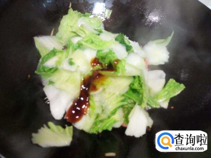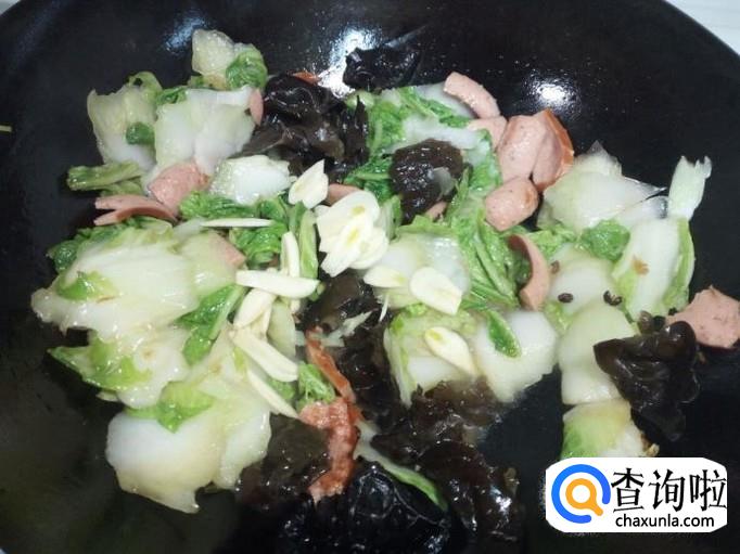 白菜片炒至六分熟,放入木耳翻炒,放入盐,蒜。