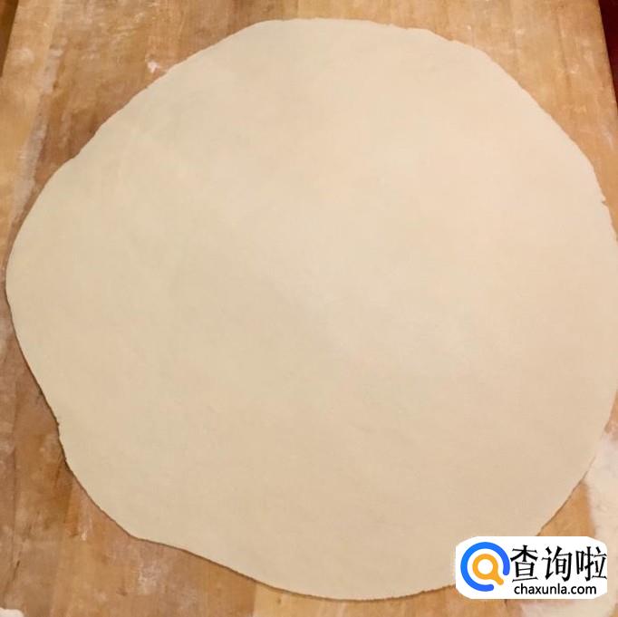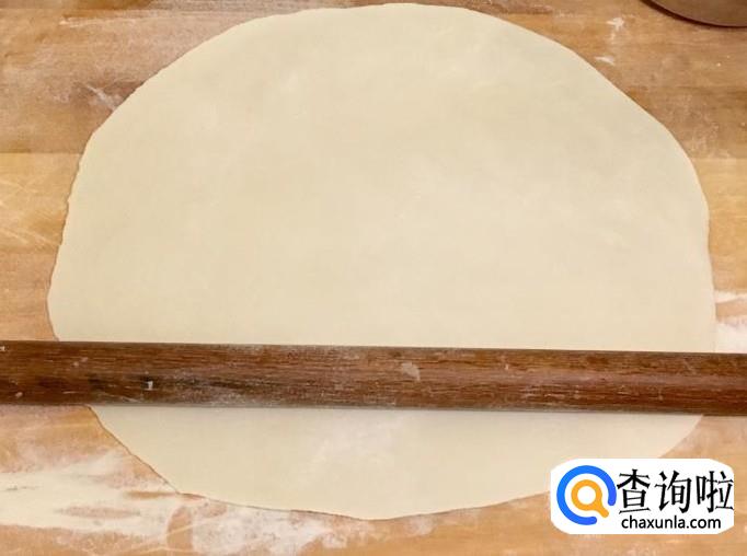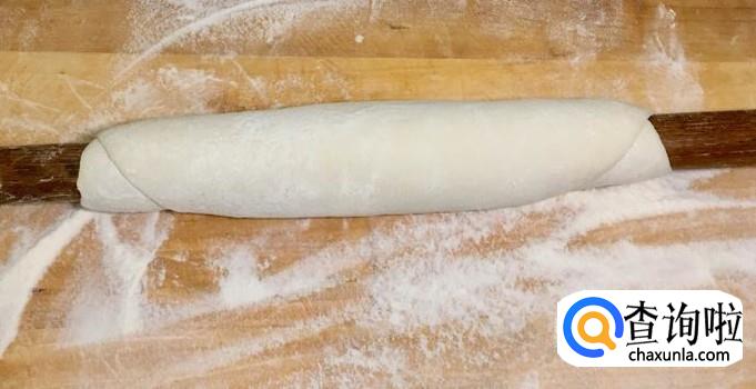 把面团擀压至能用擀面杖卷起即可,切记卷起前再铺撒一次干面粉