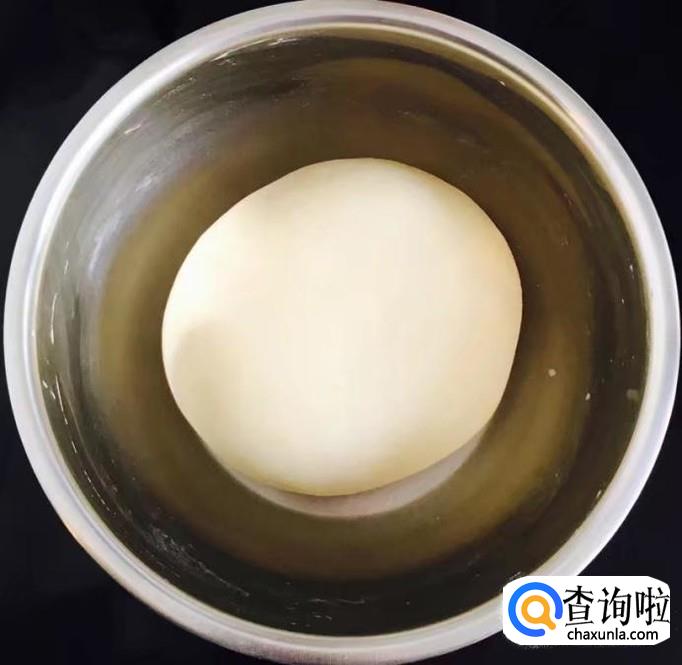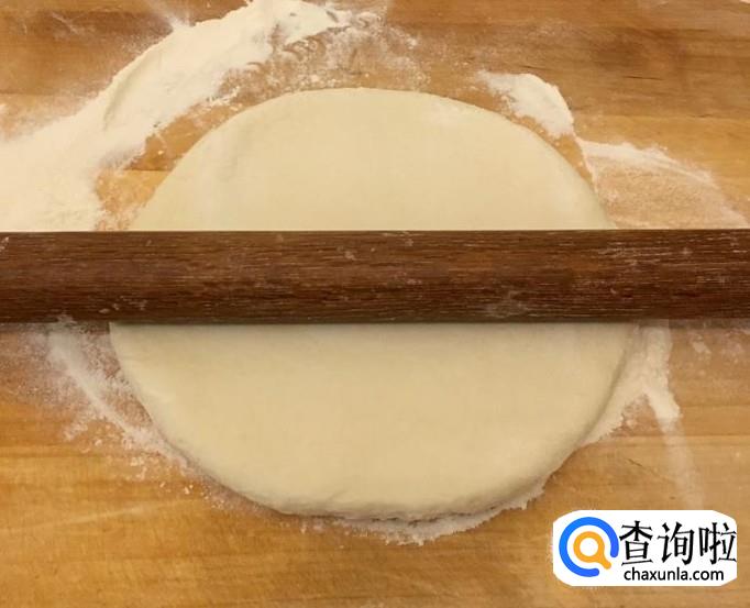 案板铺撒干面粉把醒好的面团用擀面杖擀压成圆形厚面皮